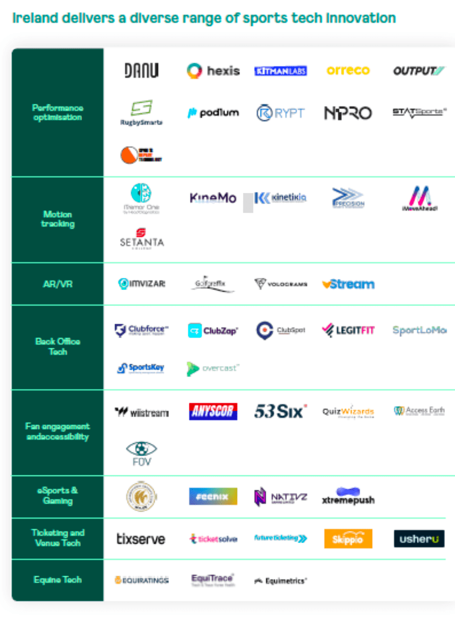 - Irish sports tech startups are now embedded across top leagues (ex. NFL, Premier League, Olympic programs).