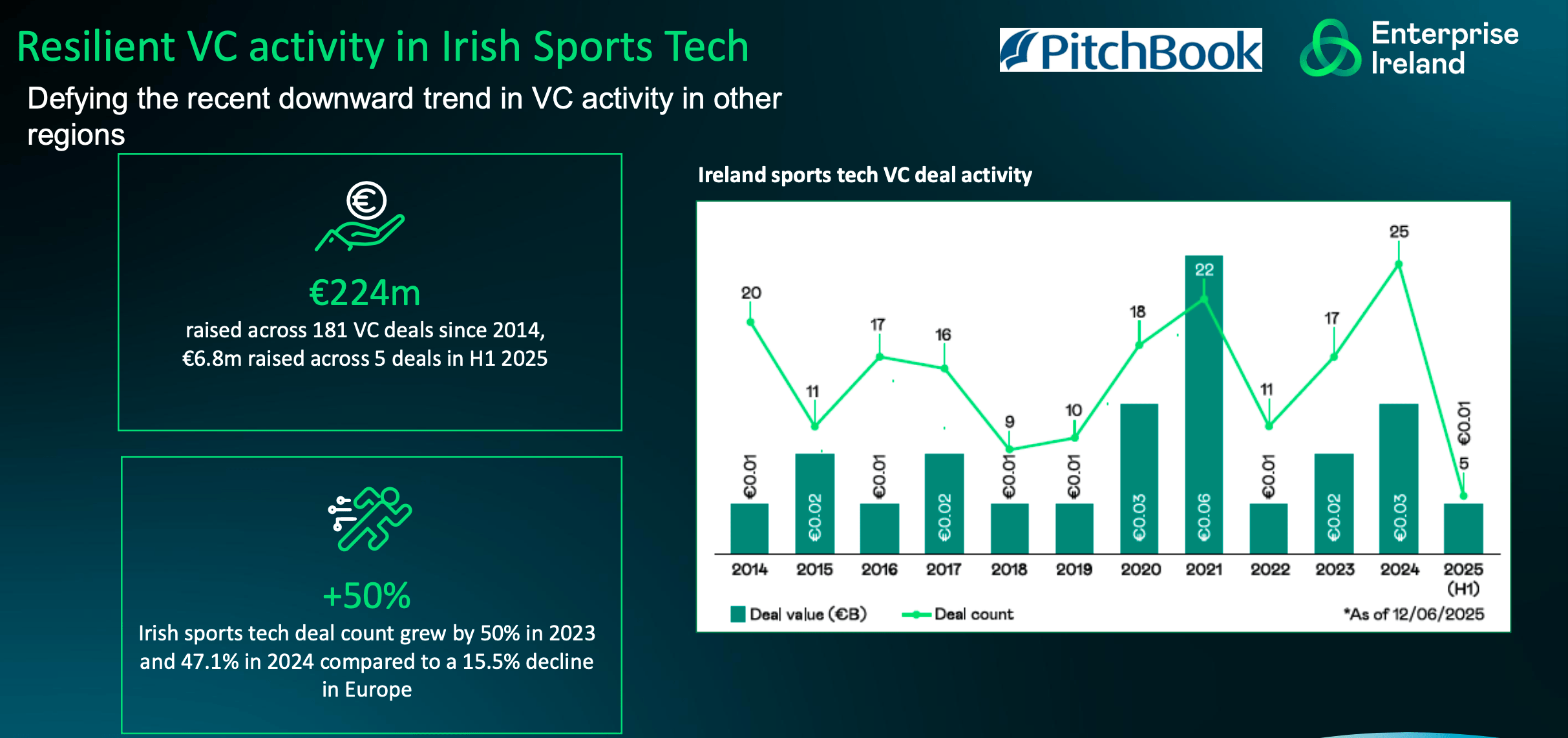 Enterprise Ireland now ranks as Europe’s #1 VC investor in sports tech by deal count.