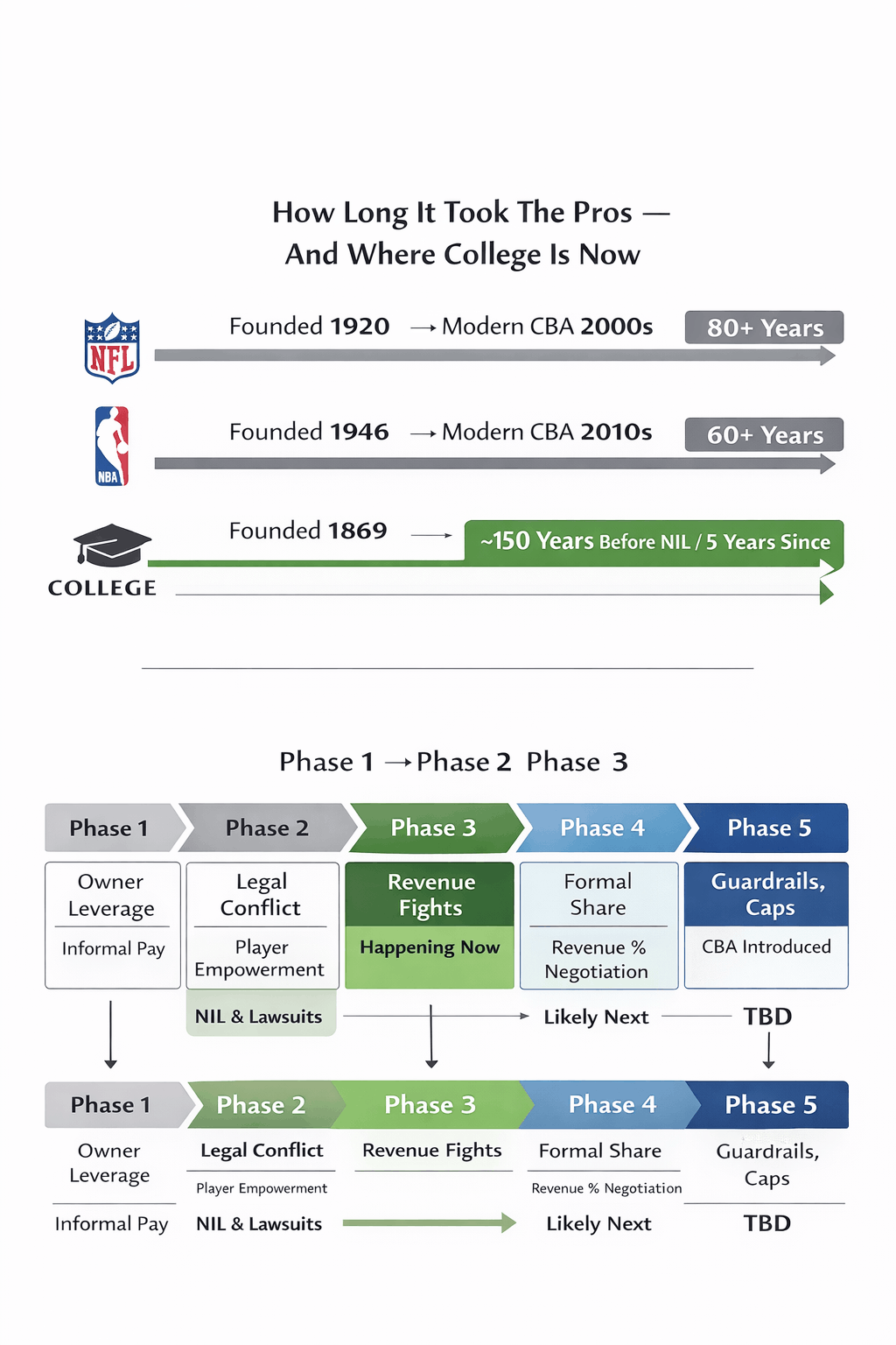 College sports are currently in Phases 3 and 4, effectively skipping 50 years of gradual evolution because the revenue infrastructure is already in place (and they’re now figuring out the labor structure).