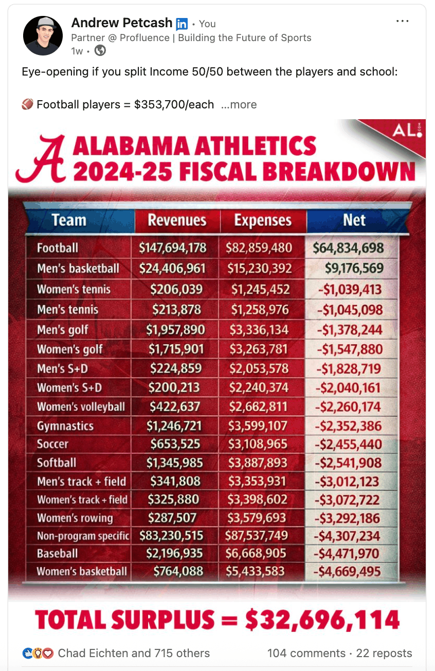 So even if the intent is “pay football players,” the knock-on effect can be “trim non-revenue sports to fund payroll.”